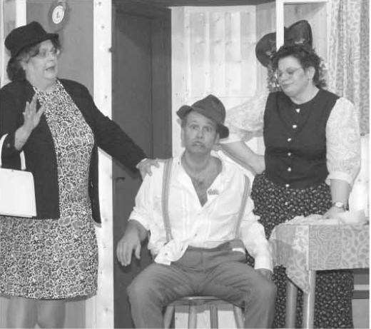 ruhigerTyp, doch als Jungbauer Wilhelm ging Wolfgang Haberstroh über vier Akte hinweg lautstark aus sich heraus. Musste er doch Kraft aus dem Steinkrug tanken um mit dem Frust fertig zu werden. In bewundernswerter Weise mimte er den selten Nüchtemen, aber ausdauernden Schürzeinjäger. Wahrlich nicht leicht hatte es da Ehefrau Frieda. Margit Dieterle musste zunächst als einzige “Normale”, alleine den Laden zusammenhalten. Unterstützung fand sie aber nicht bei ihrem Bruder Hannes. Hubert Sandner, in früheren Stücken meist mit weißen Handschuhen bewaffnet, den schützte die